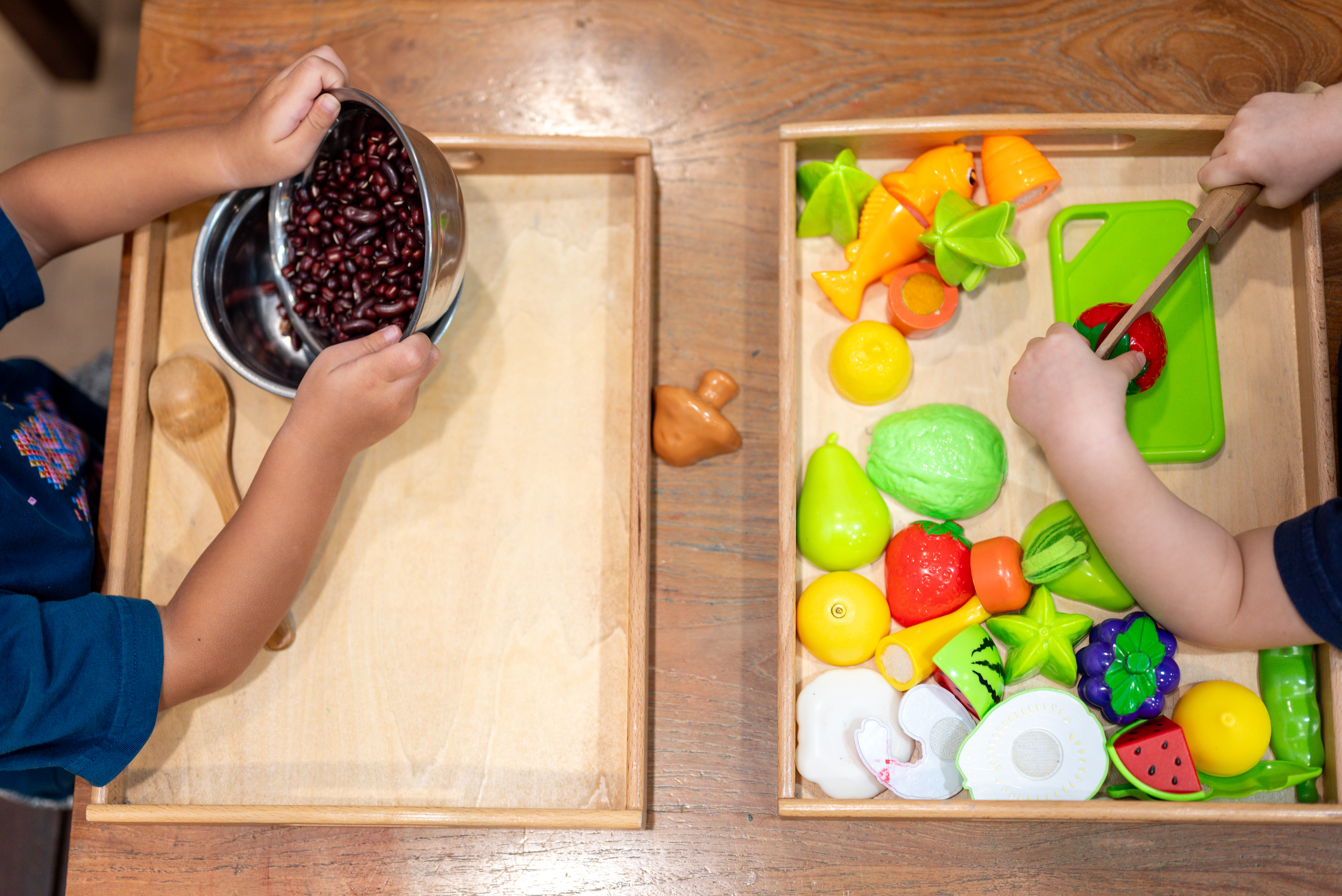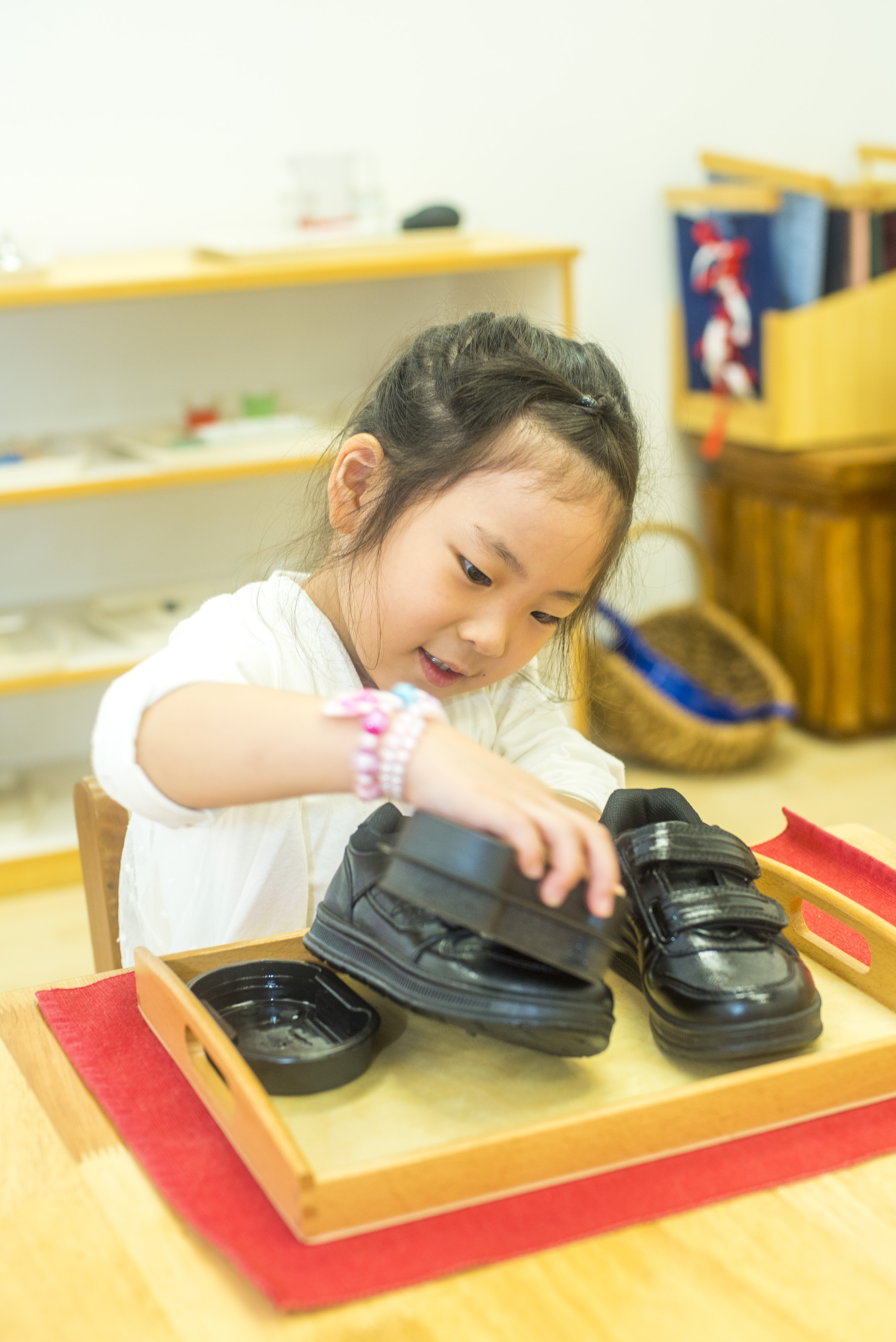Promote self-help skills through a variety of activities, including elementary exercises (holding a tray, threading beads, pegging clothes, using a funnel, sponging water), personal care (grooming, dressing, preparing food), grace and courtesy (walking around a mat, sitting on a chair, knocking on the door), care of the environment (wiping tables, sweeping floors, folding napkins, caring for indoor plants), and more.